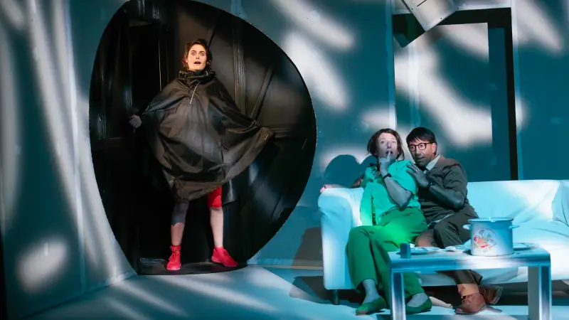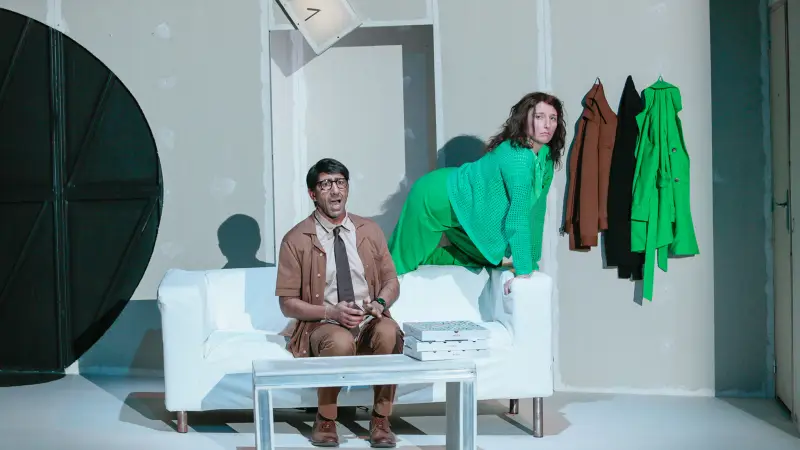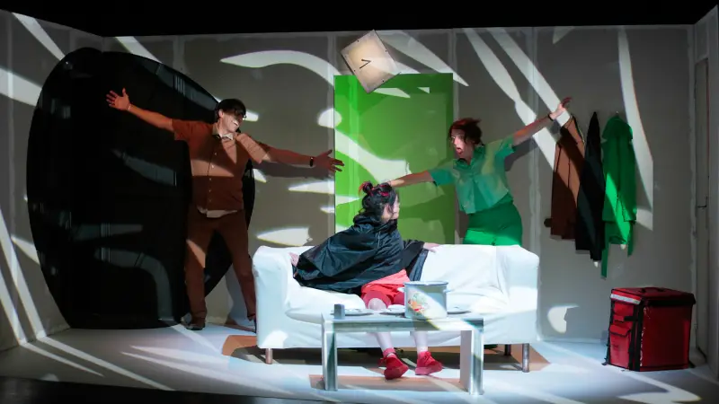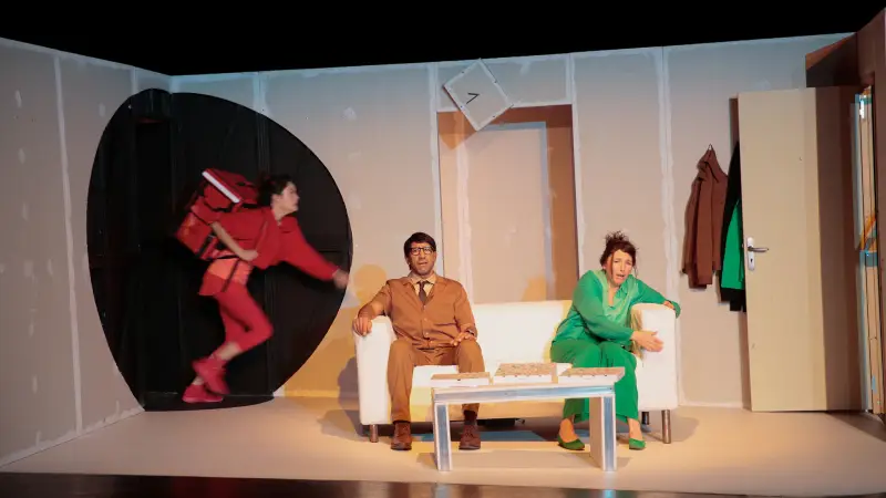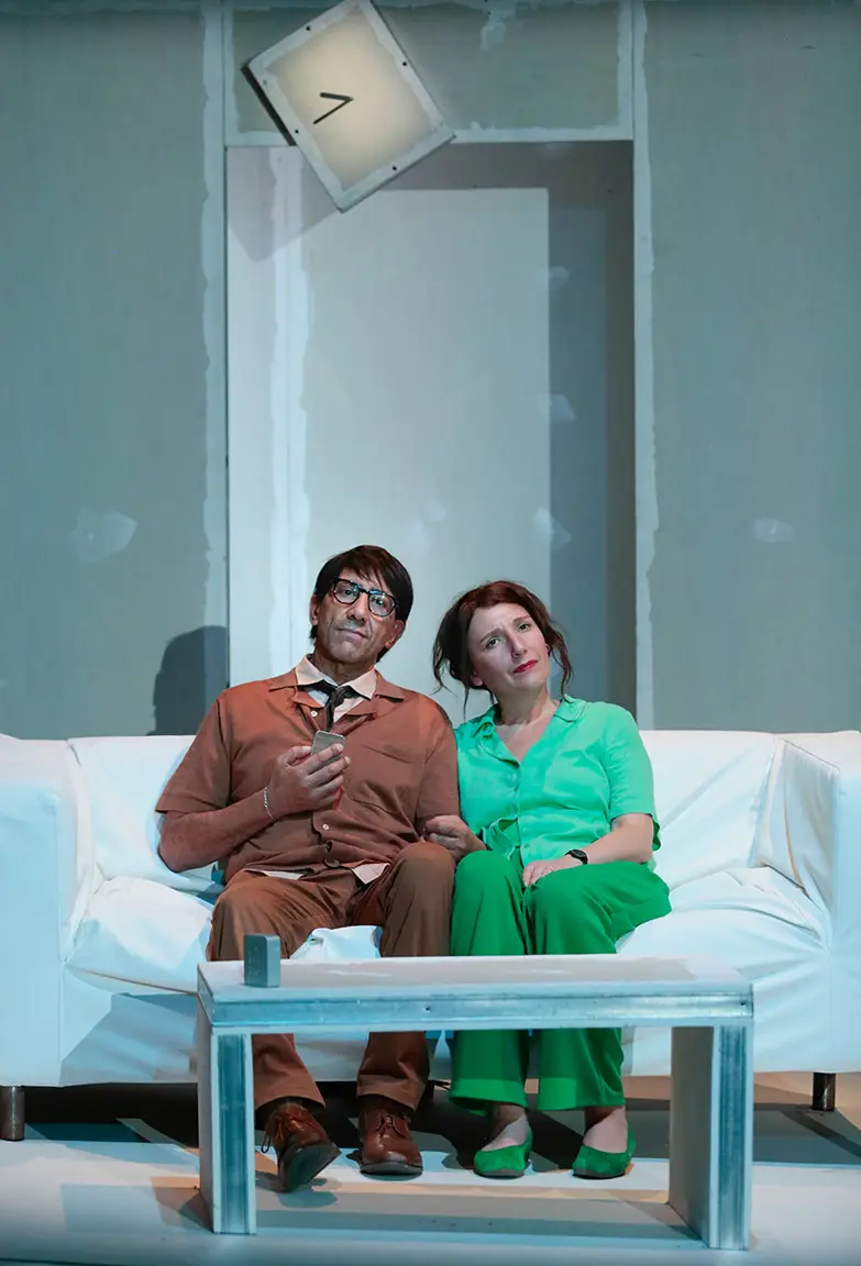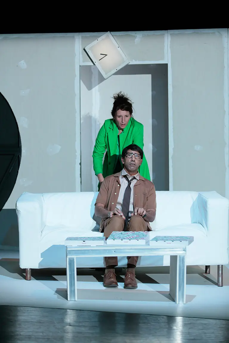 Avec cette commande passée à l’autrice pour expérimenter théâtralement notre rapport au temps et à la vitesse, Julia Vidit explore la théâtralité d’une comédie construite comme une dystopie contemporaine. Elle engage les trois acteurs à puiser toute l’énergie du jeu dans cette écriture originale aux dialogues incisifs. L’espace faussement réaliste offre la vue en coupe d’un salon de pavillon au canapé déglingué, dans lequel les personnages se battent irrémédiablement contre le temps, s’arrêtant parfois comme pour nous demander : et vous ?
