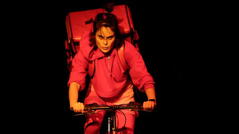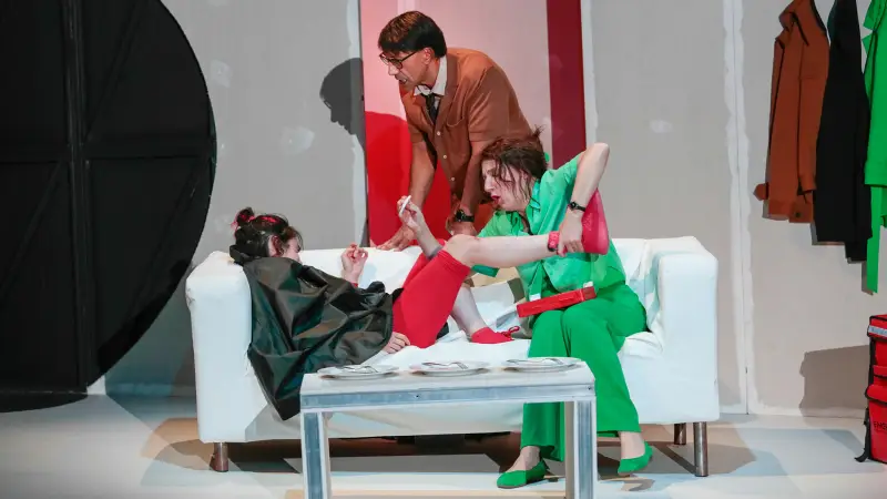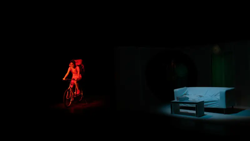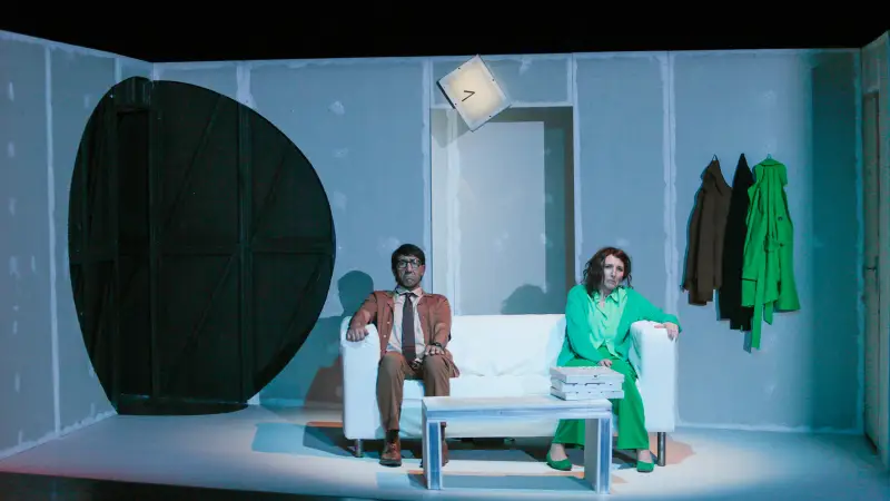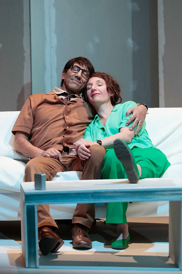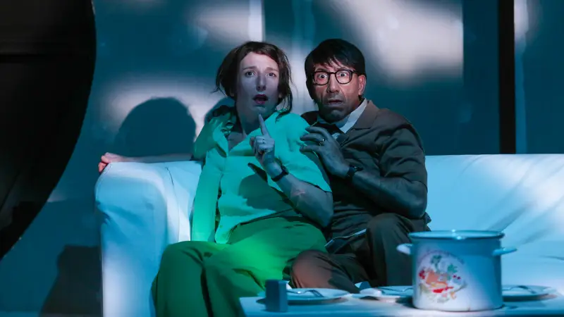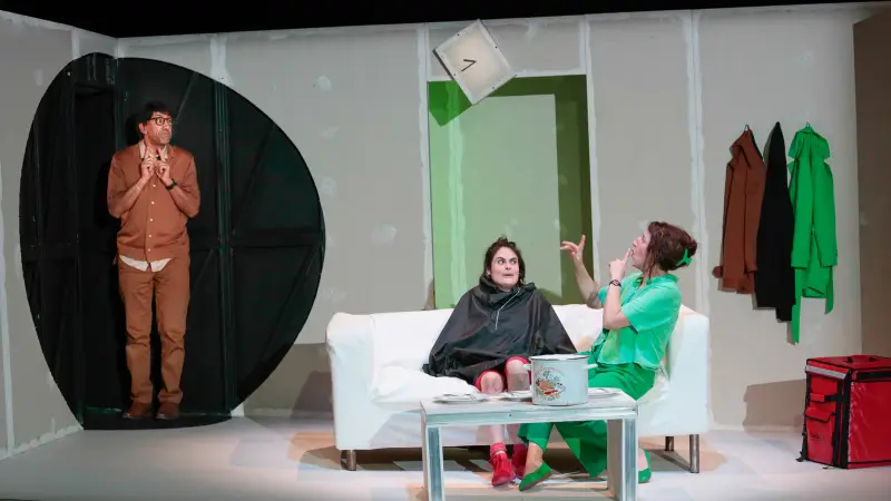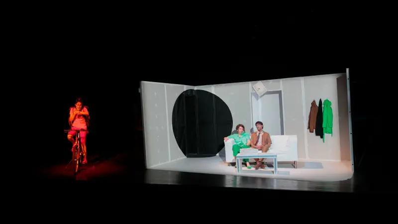Avec cette commande passée à l’autrice pour expérimenter théâtralement notre rapport au temps et à la vitesse, Julia Vidit explore la théâtralité d’une comédie construite comme une dystopie contemporaine. Elle engage les trois acteurs à puiser toute l’énergie du jeu dans cette écriture originale aux dialogues incisifs. L’espace faussement réaliste offre la vue en coupe d’un salon de pavillon au canapé déglingué, dans lequel les personnages se battent irrémédiablement contre le temps, s’arrêtant parfois comme pour nous demander : et vous ?